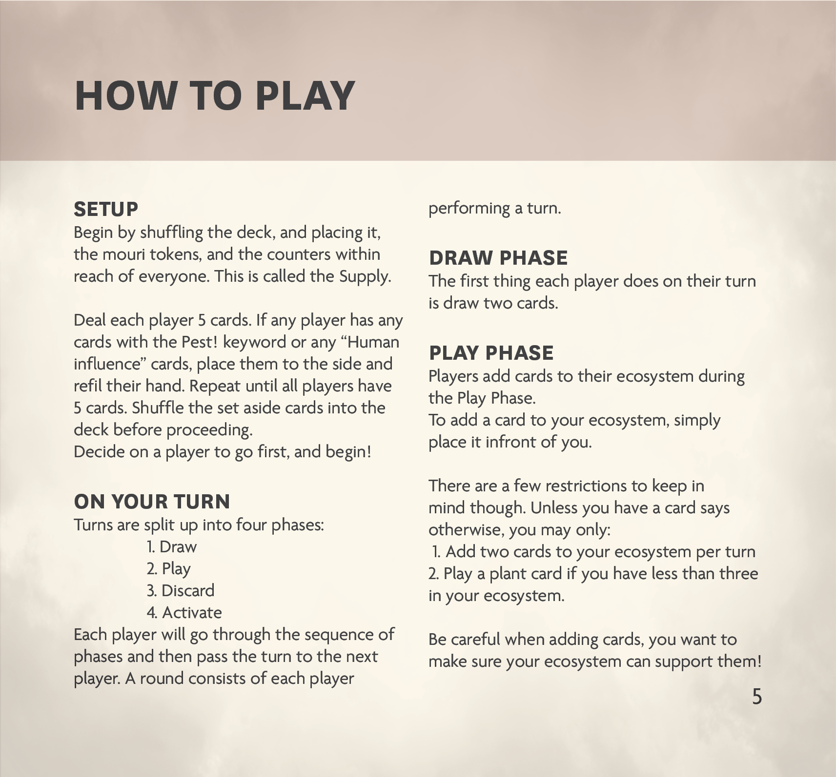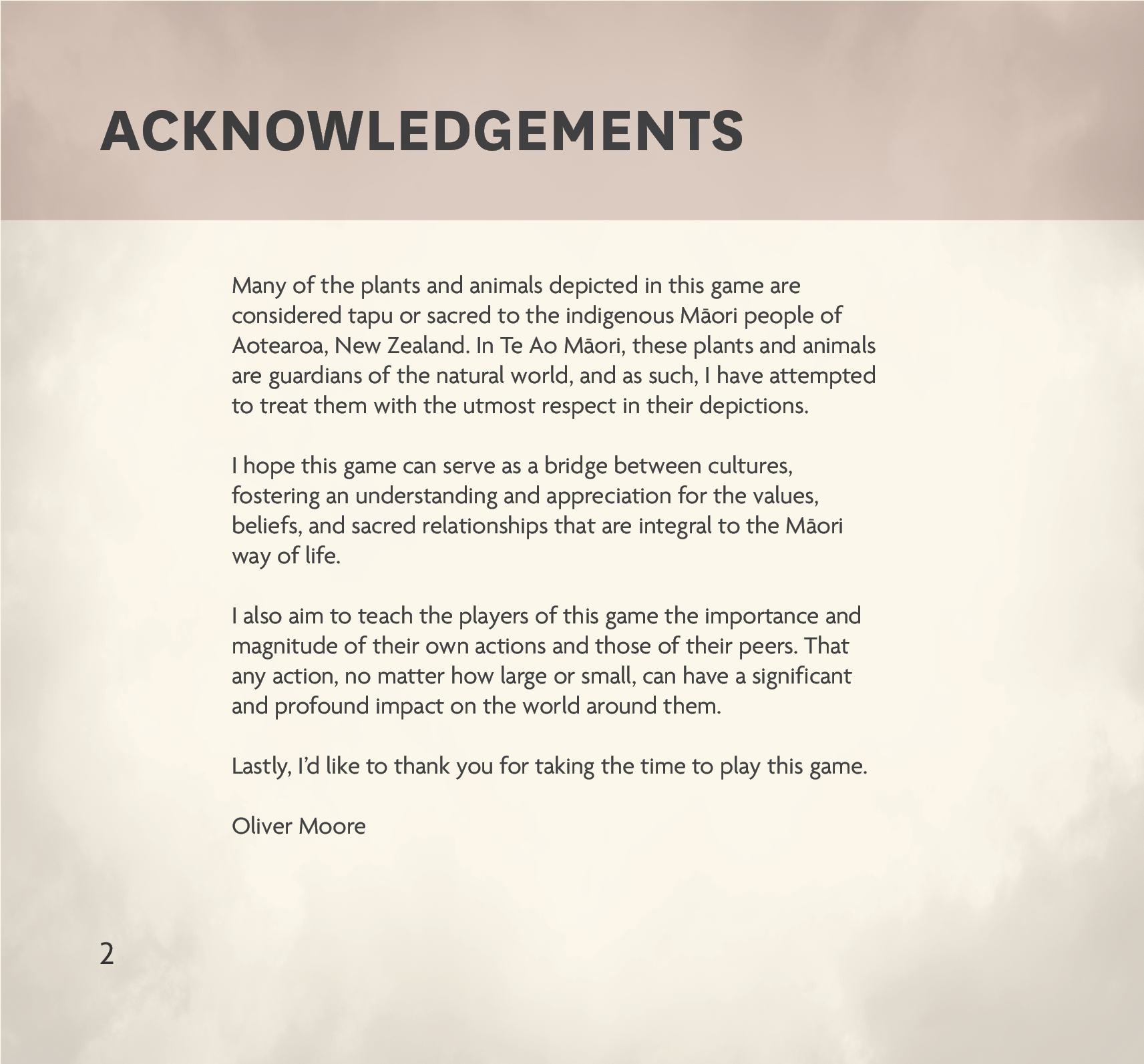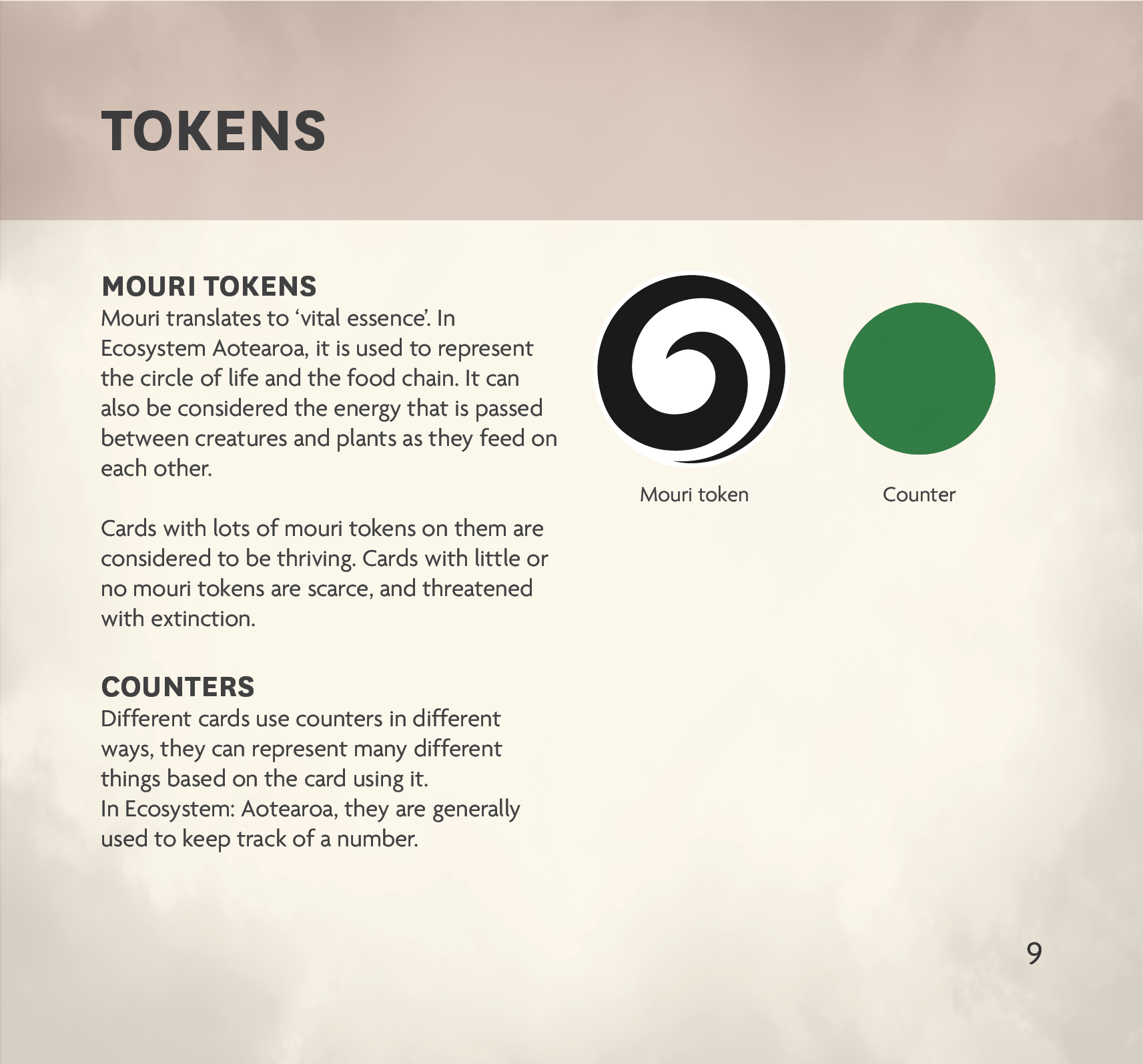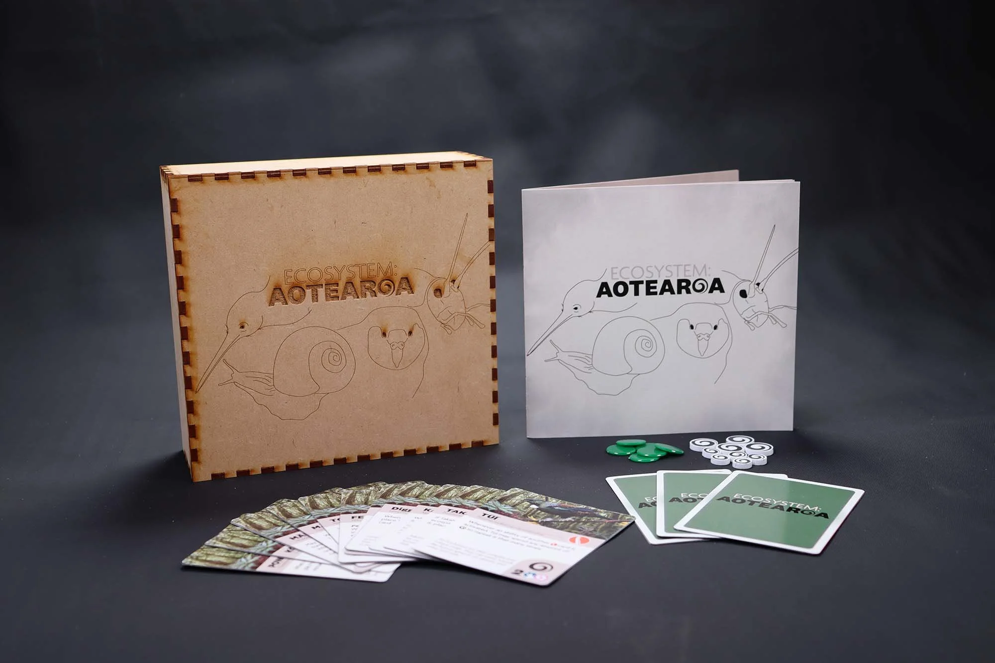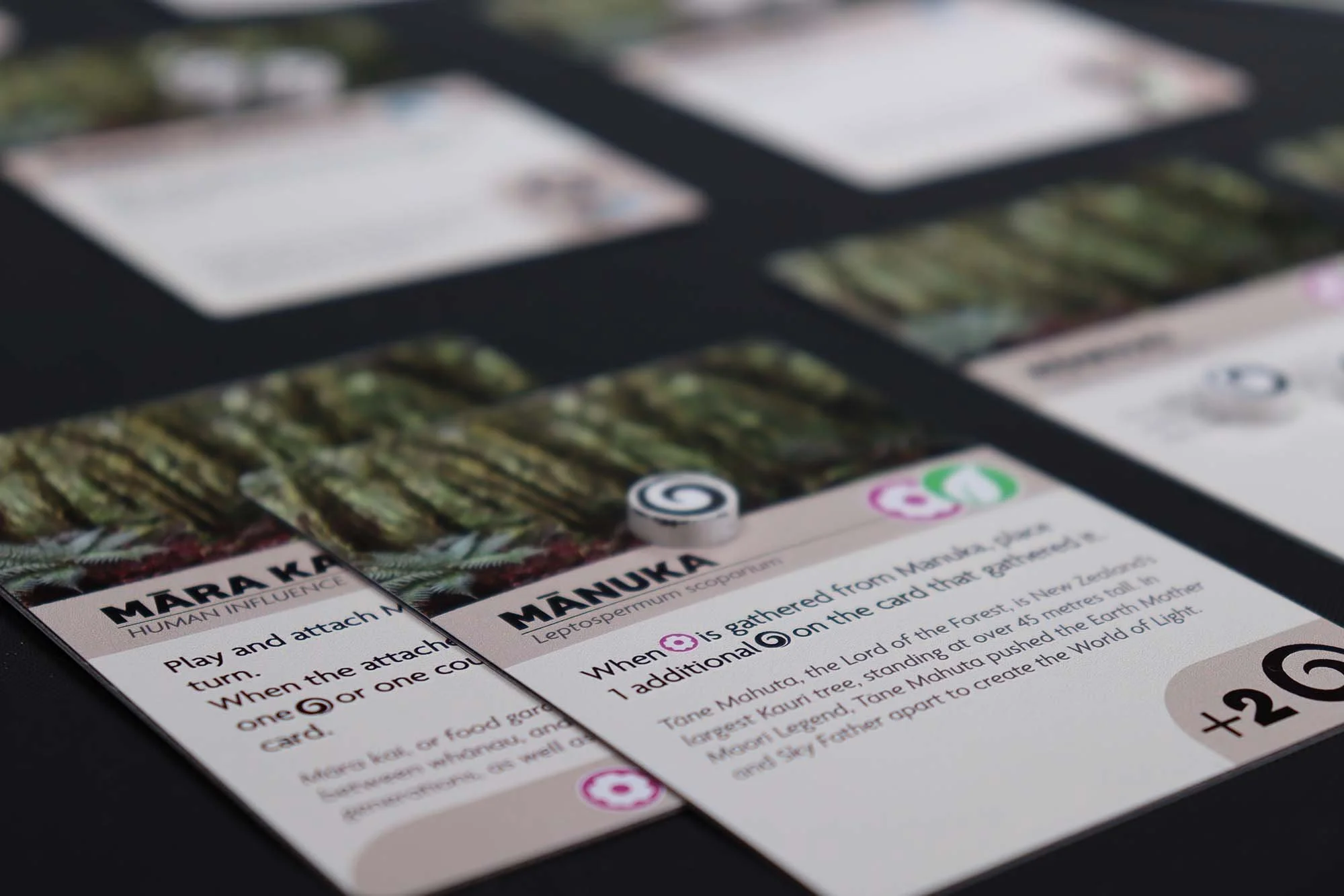 In Ecosystem: Aotearoa, players create their own ecosystem with cards that represent New Zealand's unique species. Each card plays a role in generating or transferring 'Mouri' tokens between cards or expending mouri to perform special actions based on the animal or plants' real-world behaviour.